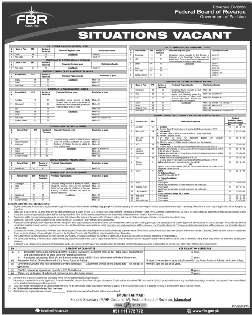 FBR required candidates for the following post. Any candidate having Pakistani domicile can apply. FBR jobs is good for the candidate.