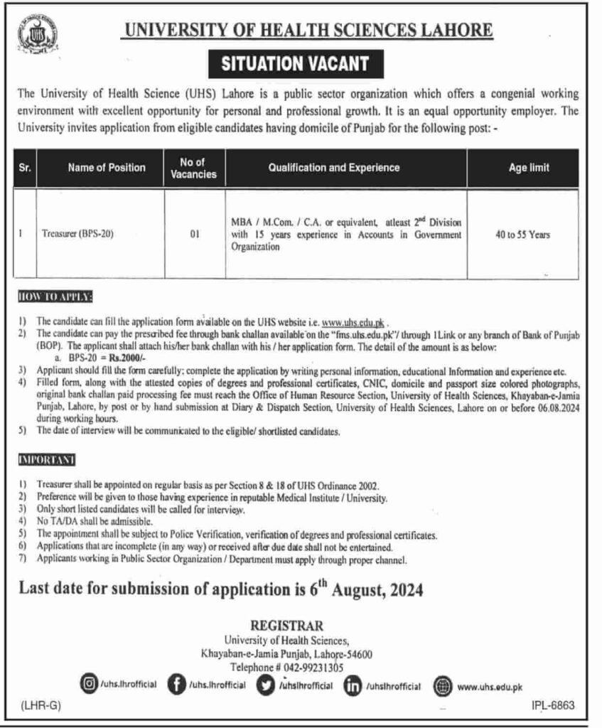 Last date for submission of application is 6th August, 2024 for University Of Health Sciences Lahore Jobs.